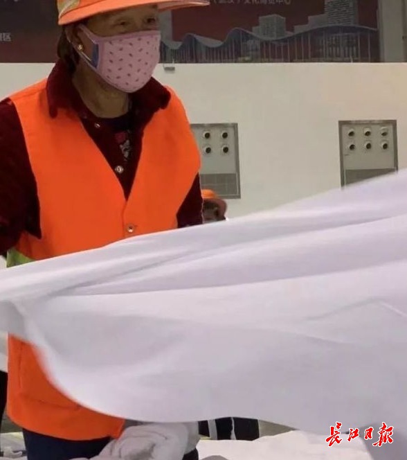 除了江汉环卫,江岸区环卫工人也赶来支援,4日上午9时至10时,江岸城管队员及环卫工人两人一组,分工协作,60分钟内铺设了300张病床,平均每2分钟铺完一张床。