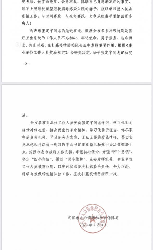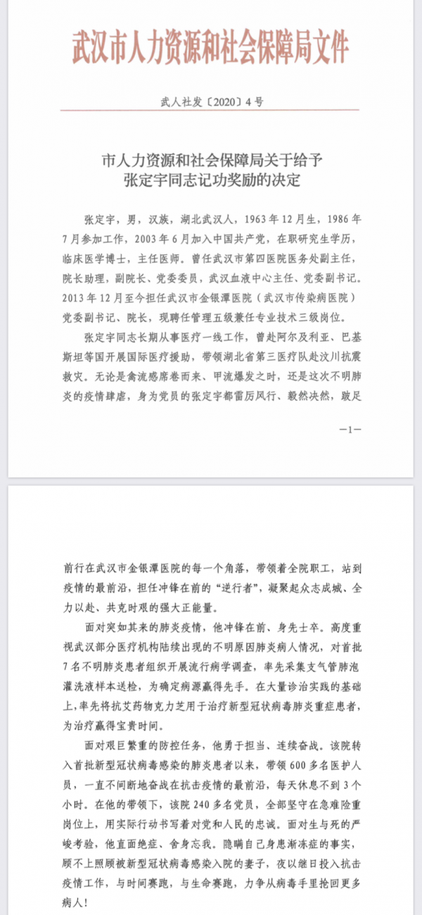 长江日报-长江网2月4日讯(记者章鸽 通讯员金睿)4日,长江日报-长江网记者从市人社局获悉,为表彰武汉市金银潭医院党委副书记、院长张定宇同志的先进事迹,激励全市各条战线特别是医疗卫生系统的工作人员不忘初心、牢记使命,勇于担当、迎难而上、共克时艰,在打赢疫情防控阻击战中发挥重要作用,根据《事业单位工作人员奖励规定》,经研究决定,该局给予张定宇同志记功奖励。希望全市各事业单位工作人员要向张定宇同志学习,学习他面对疫情冲锋在前、挺身而出的革命精神,学习他勇于担当、恪尽职守的责任担当,学习他舍身忘我、无私无畏的爱民情怀。充分发挥机关、事业单位工作人员模范作用,以战时状态坚决扛起政治责任,全力以赴、科学有效做好疫情防控工作,坚决打赢疫情防控阻击战。