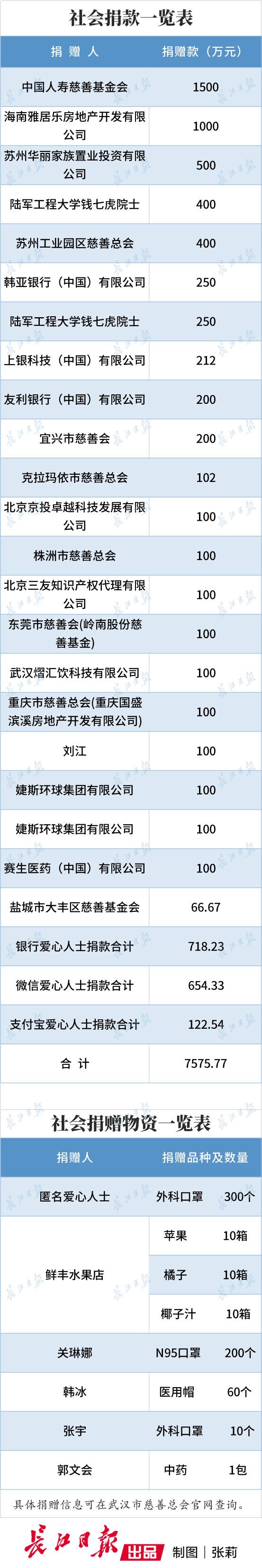 长江日报-长江网2月6日讯 1月23日,武汉市新型冠状病毒感染的肺炎防控指挥部发布第4号通告,武汉市慈善总会负责接受捐款和通用物资。现将2月5日-6日市慈善总会接受捐赠款物公示如下(具体款物使用和分配方案随后公布):
