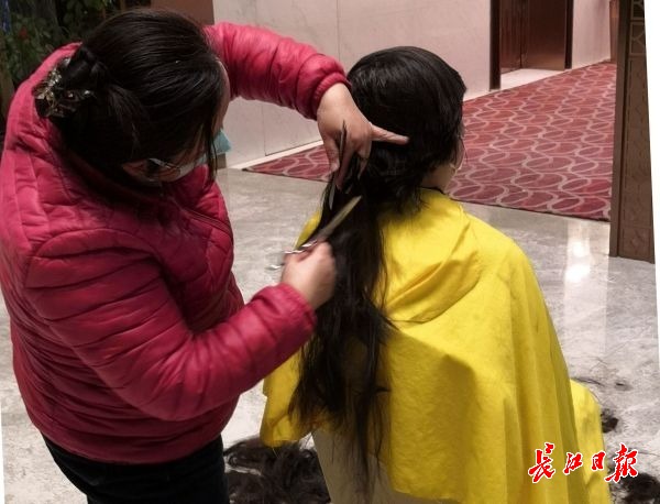 “咔嚓咔嚓……”2月5日下午5点至6日下午6点,在4家酒店大厅间隔出来的临时理发点,剪发声不断响起。大家通过微信群排队叫号,线上有序候剪。女护士们大多是二三十岁的年轻姑娘,看着陪伴自己多年的缕缕青丝飘落,一些人忍不住湿了眼眶。姑娘们剪下的长发,工作人员细心地用皮筋扎起来,写上她们的名字作为纪念。