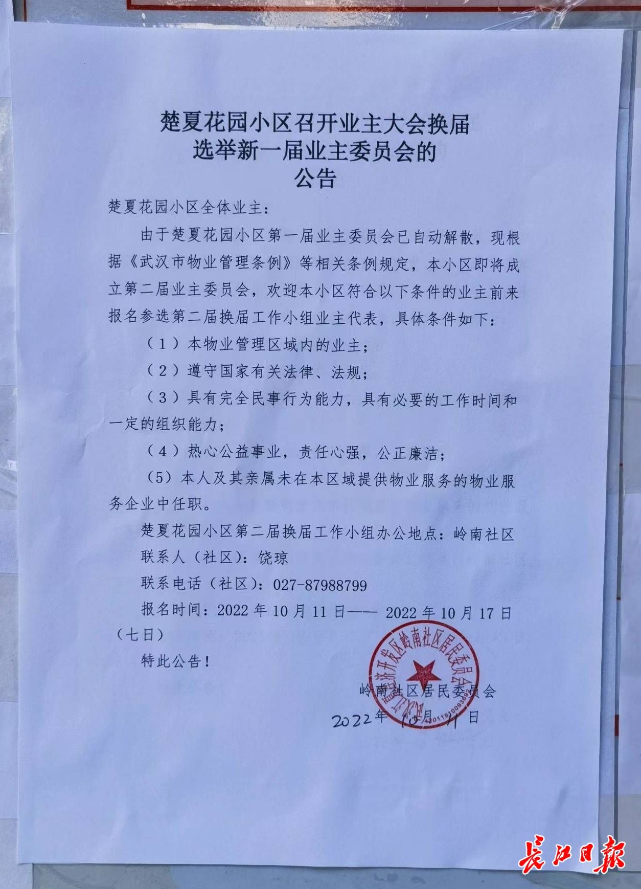 江夏区楚夏花园小区业主王先生称,10月9日,辖区岭南社区贴出一纸公告,称小区第一届业委会已自动解散,拟成立新的业委会,号召具备条件的广大业主踊跃报名,代表业主参加换届工作小组。公告中第五条写有:“履行行业义务,按时交纳物业管理费。”