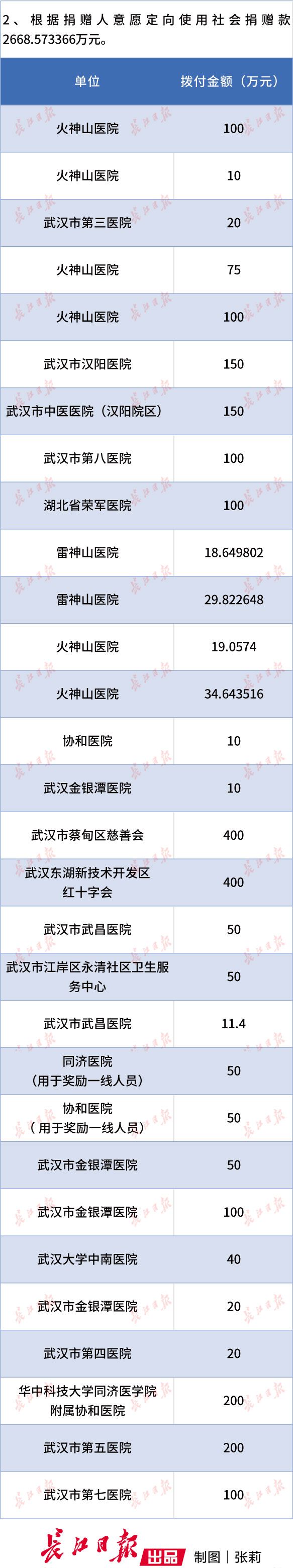2月9日,由武汉市新冠肺炎防控指挥部统一调配使用市慈善总会社会捐赠款4亿元,其中有100万元定向捐赠用于奖励同济和协和医院一线人员。长江日报-长江网记者在公告中看到有两笔50万元定向捐赠,分别是用于奖励同济和协和医院一线人员各50万元。