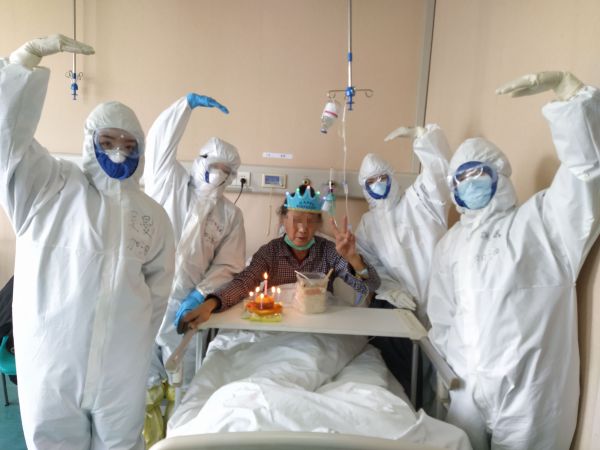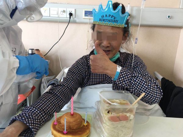 2月9日临近中午,黄如娴在家先用一大一小两个面包做了个生日蛋糕,并插上几根蜡烛,然后下好长寿面。当生日蛋糕和长寿面出现在易老先生面前,护士们在隔离病房放起生日歌,易老先生不仅感动落泪。“呼吸与危重症医学科七病区的护士们让我度过了一个永生难忘的生日,让我重拾战胜病毒的信心。虽然你们穿着防护服,看不清你们的脸,但我相信你们都是最美的白衣天使。”易老先生说。