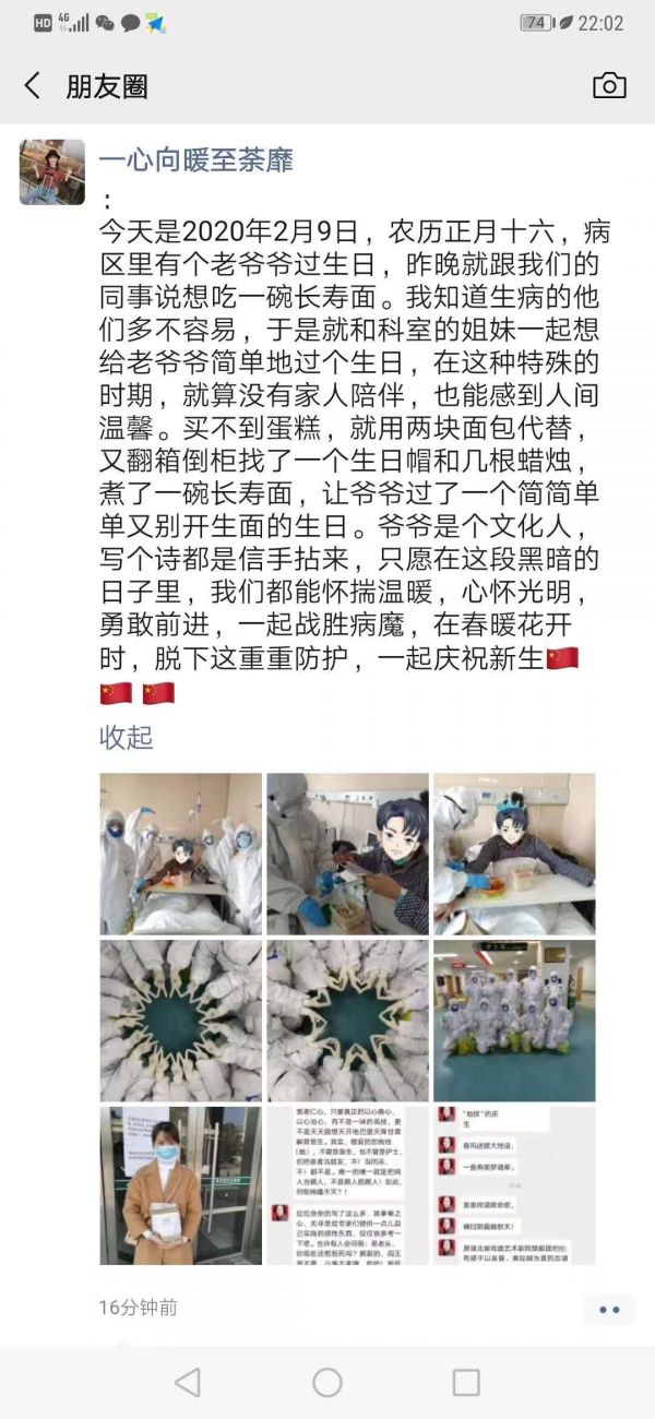长江日报—长江网2月10日讯(记者武叶 通讯员马遥遥)“春风送暖大地谙,一盒寿面梦魂牵。医患同谱救命歌,横扫阴霾换新天。”2月9日中午,武汉市中心医院后湖院区战时呼吸与危重症医学科七病区,患者易老先生在这里度过了76岁生日。他没有想到特殊时期,还能吃上护士精心为他准备的长寿面,随后有感而发得吟诵了这首诗。