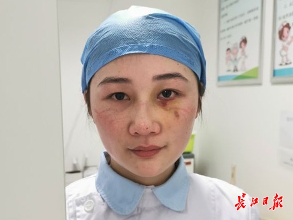11日下午,长江日报-长江网记者在武汉市肺科医院ICU更衣室外遇到了张美玲。她的左眼下方还有两处明显的瘀紫,鼻梁有一点歪斜。她年轻的脸上,口罩勒痕和瘀伤掺杂在一起,看上去让人心疼。