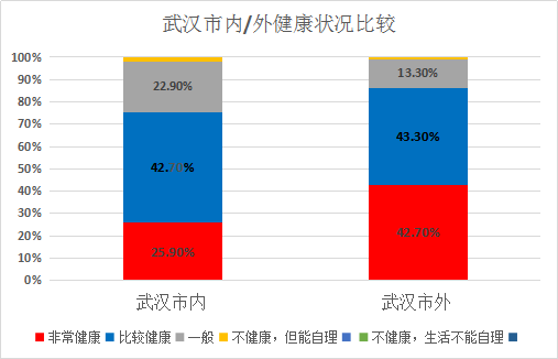 此外,武汉市内人群的食欲及体重增加均较外地人低。武汉人认为自己非常健康的占25.9%,明显低于外地的42.7%,但认为“比较健康”的武汉人较多,占了43.3%,市外为42.7%。武汉人认为 “一般”的占22.90%,市外为13.3%。总体上,认为自己状态一般以上的武汉人达到了91.5%,而外地这一数据为99.3%。说明疫情对武汉的健康状况产生了明显影响。