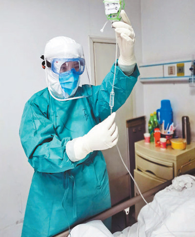 中山大学孙逸仙纪念医院呼吸内科二区“90后”护师袁汉珍,与同事一起驰援武汉市汉口医院,坚守病患救治一线。图为袁汉珍正在为病人输液。鲜 敢 张 阳摄影报道