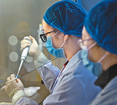 重庆市长寿区疾病预防控制中心“90后”女检测员文纤纤(左)、杨涵与病毒“零距离”对峙,持续战斗在新型冠状病毒PCR检测室,为患者的诊治争取了宝贵时间。图为两位检测员在提取化验结果。樊 强摄(人民视觉)