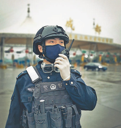 四川成都市青羊区公安分局民警杨桐今年28岁,新婚不久的他投入防疫一线,在高速公路收费站执勤,每天平均盘查1000余台车辆,为2600余人测量体温。图为2月12日,杨桐在岗位上通过对讲机与同事沟通工作。记者 王明峰摄