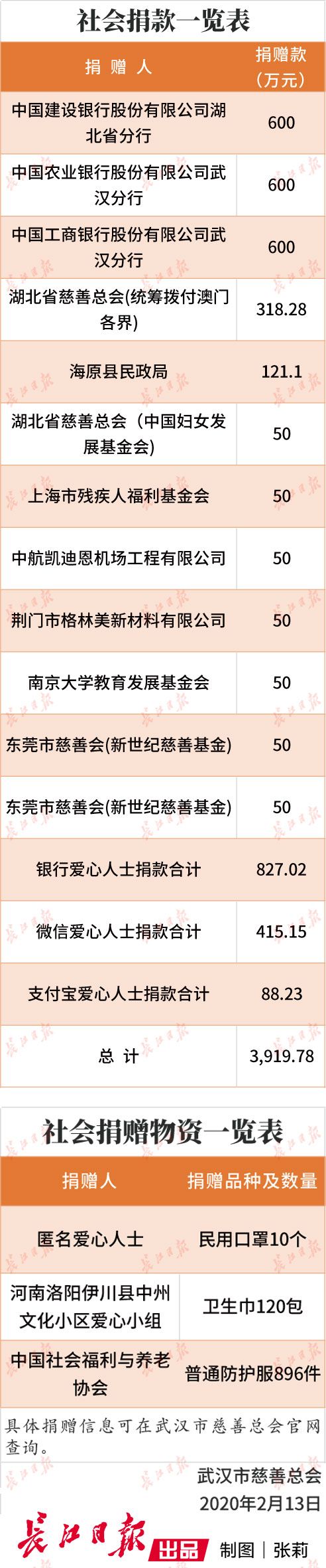 长江日报-长江网2月13日讯 2月13日,武汉市新冠肺炎防控指挥部发布第4号通告,武汉市慈善总会负责接受捐款和通用物资。现将2月12日-13日(2月12日12:00—2月13日12:00)市慈善总会接受捐赠款物公示如下(具体款物使用和分配方案随后公布):