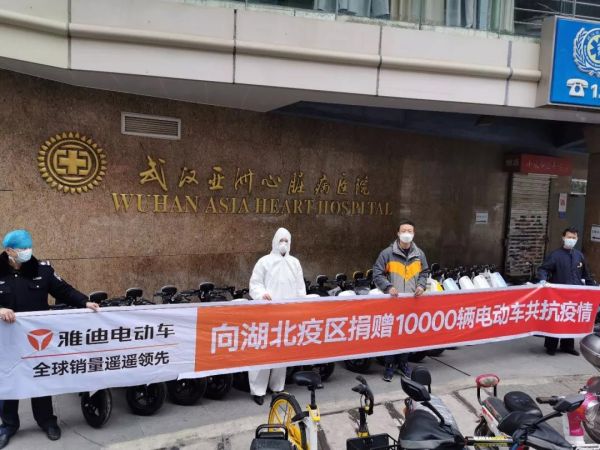 雅迪科技集团负责人称,在向湖北疫区捐赠的10000辆雅迪新国标电动自行车中,8000辆由作为疫情指挥中心物资调配组的武汉市应急管理局接收,并由其分配至武汉市卫生健康委员会4600辆,用于医护人员的出行。同时,向社区等一线工作人员按需分配3400辆,用于保障城市正常运转的工作人员出行。另外2000辆雅迪新国标电动自行车,则由雅迪科技集团分别捐赠给黄冈、孝感等市。