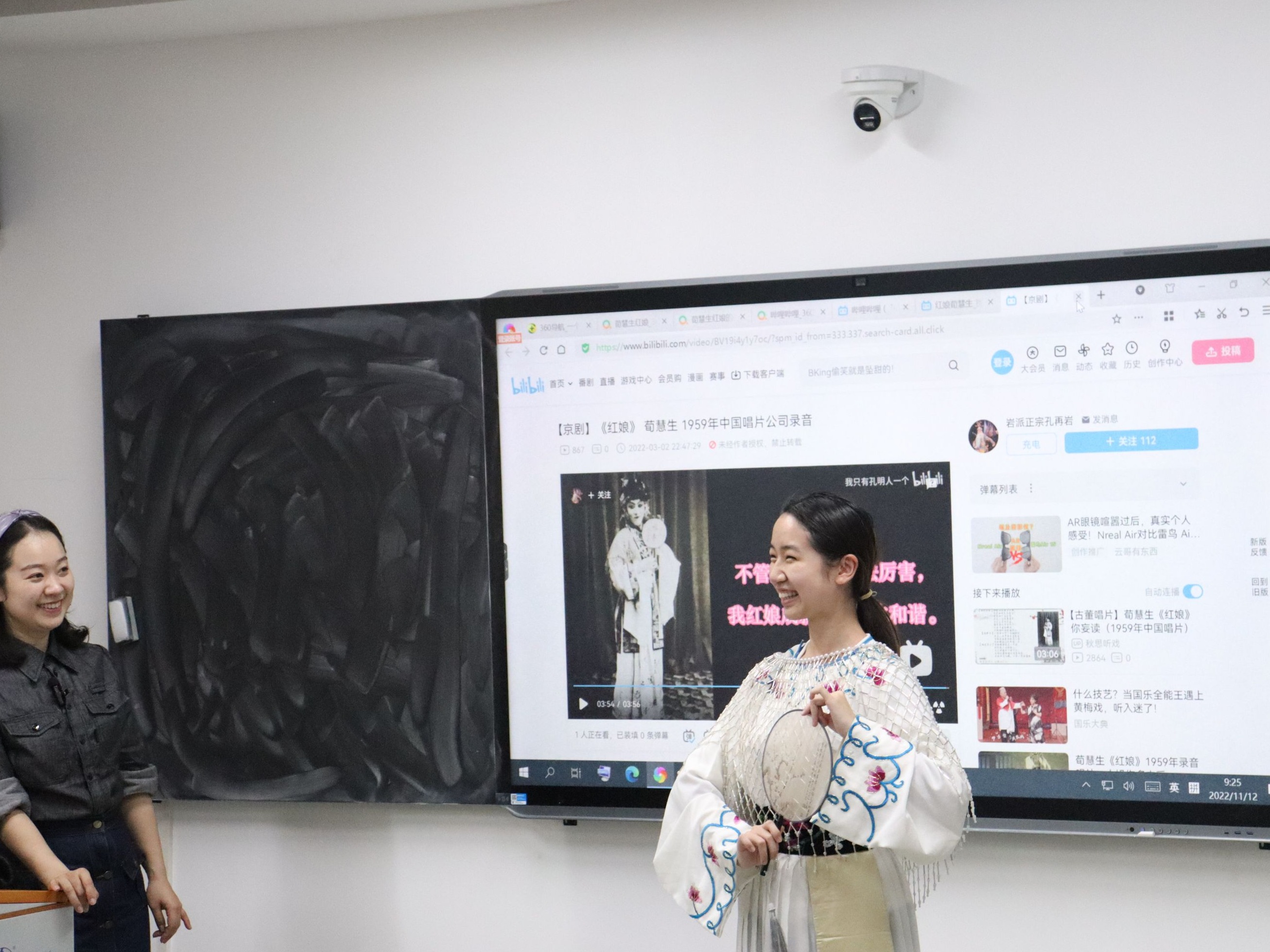 课堂上,陆艺君以《西厢记》为例,讲解了京剧唱腔及行腔中所体现的“圆”的艺术特征,并通过“指”“看”“听”“走”四个动作和《红娘》片段的表演,向同学们生动呈现了京剧欲前先后、欲放先收的独特韵味和字正腔圆的京腔魅力。