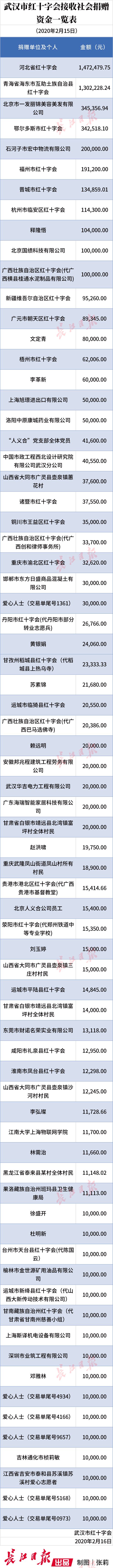 2月15日,武汉市新冠肺炎疫情防控指挥部已拨付物资至湖北省妇幼保健院、湖北省疾病预防控制中心、武汉市金银潭医院、武汉火神山医院、武汉雷神山医院、武汉同济医院、武汉协和医院、武汉大学人民医院、武汉市武昌医院、武汉市第三医院、武汉市中心医院、武汉市中医医院、长江航运总医院、武汉市疾控中心、蔡甸区妇幼保健院、黄陂人民医院、各区卫生健康局、各区疫情防控指挥部等多家单位。现将2月15日接收社会捐赠款明细公示如下,更多明细内容可登录武汉市红十字会官网查询。
