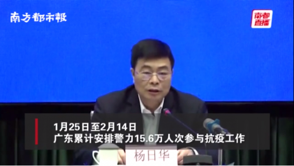 广东公安厅:15.6万警力参与抗疫,叫停上千起大规模民俗活动 2020-02-17 14:04 南方都市报 0 点击图片查看视频 2月16日下午,广东省政府新闻办举行第二十二场疫情防控新闻发布会,通报广东新冠肺炎疫情和防控工作情况,重点介绍广东公安机关落实联防联控、打击违法犯罪、加强社会治理与服务等情况。省公安厅党委副书记、常务副厅长杨日华在发布会上透露, 1月25日至2月14日,广东累计安排警力15.6万人参与抗疫工作。全省公安机关出动巡逻防控力量191万人次,叫停1093起大规模民俗活动。 视频:张驰 【编辑:戴容】