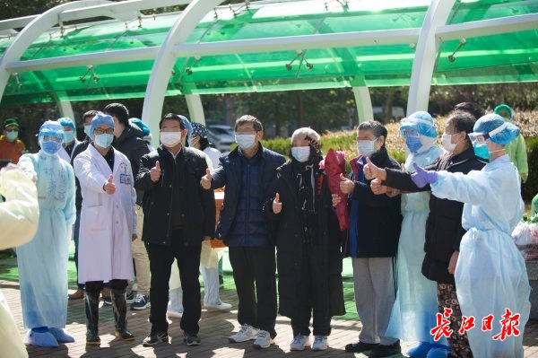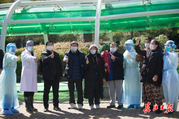 2020年2月17日,武汉市金银潭医院出院台胞江肇南先生(左四)和医生、出院患者一起合影。