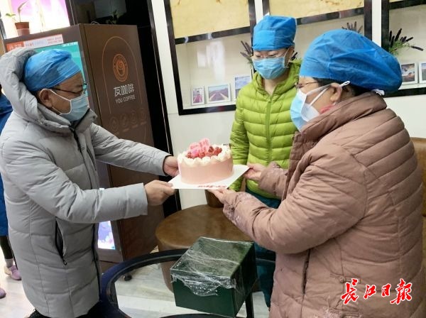 2月16日下午4点,哈尔滨医科大学附属第一医院王勋医生返回至下塌的酒店,一份生日蛋糕为她41岁的生日送上一份特别的祝福。这个8寸的小蛋糕,凝聚了医疗队接待方、爱心人士的一份心愿:逆行支援武汉的医疗队队员们,你们人可以受累,心里一定要暖。2月13日,哈尔滨医科大学附属第一医院160人的医疗队飞抵江城,定点支援武汉市第一医院新冠肺炎重症病房,一医院保健科主任宋峥负责对接服务该医疗队。通过医疗队提供的信息,细心的宋峥注意到,截至3月底共有19名医疗队队员过生日,最近的一个生日在2月16日。此时的武汉,已经很难买到一个生日蛋糕。15日晚上10点30分,宋峥求助爱心人士王䶮。王䶮为宋峥的这份细心感动,随即把这一需求信息发至同学群,其中一位同学联系上仟吉。仟吉答应赶做一个出来,但实在抽不出人手送货,要求上门自提。16日下午2点,宋峥的同事开车领回蛋糕,放至医疗队下塌的酒店。下午4点,从重症病房结束工作的王勋医生走入酒店大厅,宋峥和医疗队领队赵长久书记共同捧上生日蛋糕,祝福她生日快乐,感谢她的付出。生日蛋糕的199元是爱心人士王䶮自掏腰包,他说,医疗队接下来的18份生日蛋糕,他将全部承包。王䶮一直在为医院捐钱捐物,联系生日蛋糕的当晚,他通宵奋战在湖北省中山医院改建隔离病房现场。王䶮说,“我是武汉伢,保卫的是自个的家,医疗队队员冒着生命危险来帮助我们,一定要对他们好!”