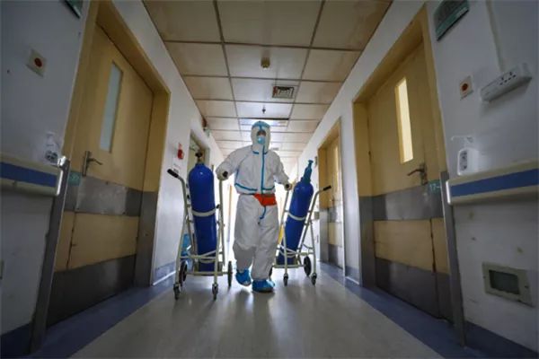邓新财是协和武汉红十字会医院医务科的工作人员,他负责每天把氧气瓶运送到各病区并回收空瓶。一个灌装满的氧气钢瓶大约120斤重,每天他要穿着隔离服在各隔离病区往返。最多的时候,他一天搬了近200个氧气瓶。“看到患者吸到氧气后能够更舒服一些,我觉得我做的都是值得的。”(武汉市江汉区纪委监委供 陈卓 摄)