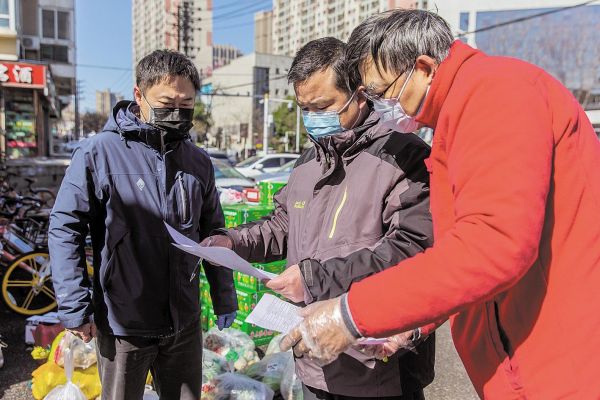 2月16日,在武汉市洪山区卓刀泉街道红星社区尚文创业城小区大门口,来自省直单位的党员张舒、谭卫东和王锦东,正在核对小区居民团购物资清单。 (湖北日报全媒记者 梅涛 摄)
