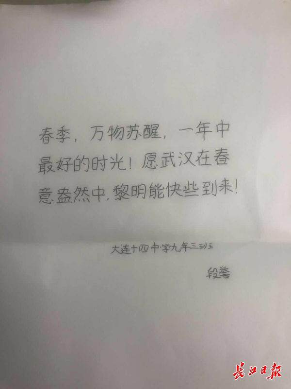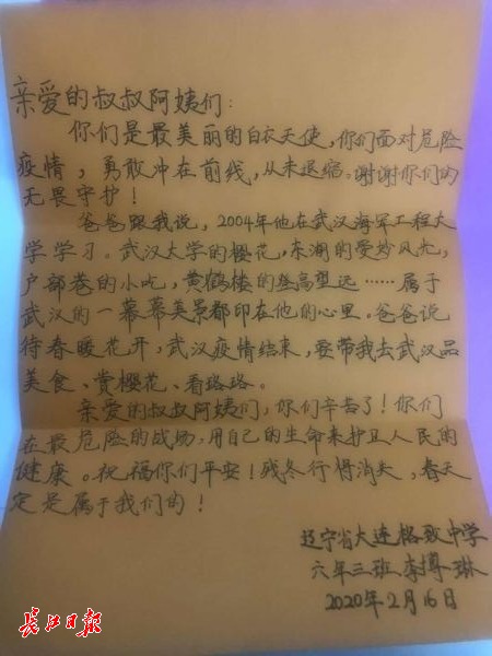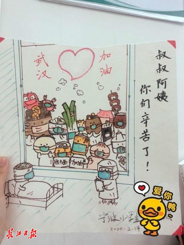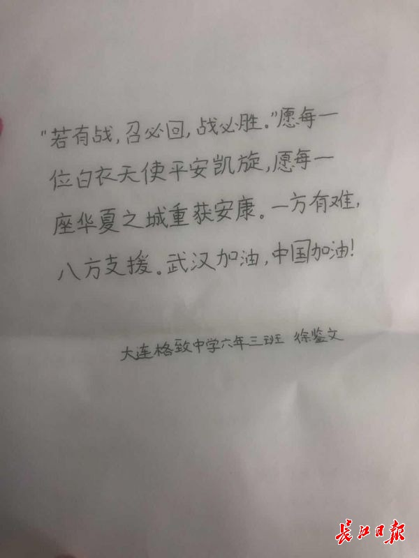 “武汉加油,叔叔阿姨你们辛苦了。”2月16日,武汉市第三医院首义院区收到来自宁波的一位小学生手绘的“团圆漫画”。2月20日,医院收到了来自大连格致中学、小学多位学生定向捐赠来的物资。大连格致中学小学部的李雨霏说:“看到电视中你们原本光滑的脸颊,被护目镜压的斑斑驳驳,您们也有亲人,您们为了祖国这个大家,放弃了小家的团聚,您们亲切笑容是病人心中的一缕阳光,加油,武汉明天一定更好。”