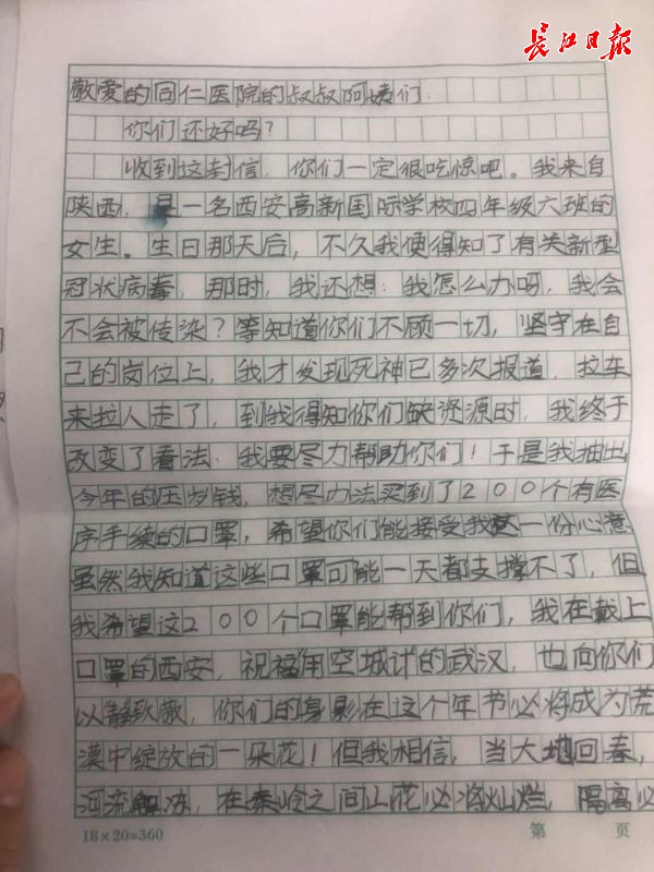 长江日报-长江网2月20日讯 19日,西安高新国际学校小学部的薄梓仁同学,拿出今年的压岁钱,想尽办法买到200个口罩定向捐赠到了武汉市第三医院。薄梓仁同学在信中写道:“我在戴口罩的西安,祝福英雄城市‘武汉’,我相信大地回春,秦岭之间山花灿烂,到那时候,我去武大看樱花,也请你们登长城,吃泡馍。”