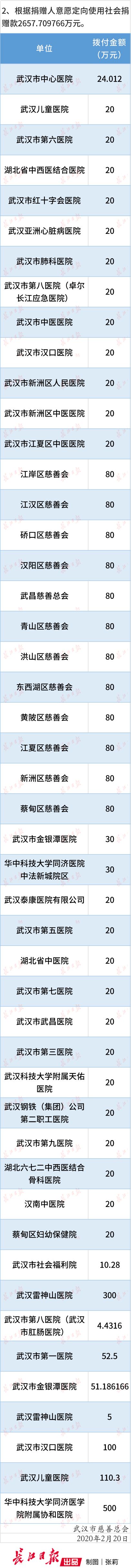 长江日报—长江网2月22日讯(记者杨帆 通讯员汪亮)截至2月20日,市慈善总会接收捐赠款38.813071亿元。已公布使用37.08亿元,其中非定向34.92亿元定向2.16亿元,已使用95.53%。其中第9批使用社会捐款情况如下,使用资金2.58亿元,主要用处各个定点医院和方舱医院。后续使用社会捐赠款情况将陆续公布。武汉市慈善总会表示,将依法依规依程序公开透明使用社会捐赠款,欢迎社会各界监督。