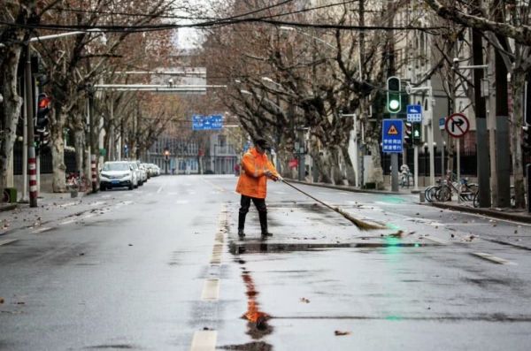 武汉街头,清洁工正戴着口罩扫地