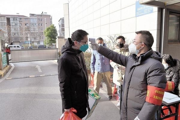 2月17日下午,武汉市蓝晶绿洲小区门前,下沉社区值守的几位省直机关工作人员在给居民测体温。 (湖北日报全媒记者 周立新 蔡俊 摄)