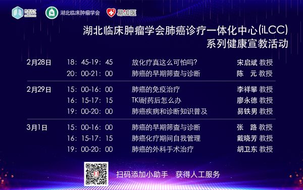 长江日报-长江网2月27日讯(记者毛茵)由湖北省临床肿瘤学会“肺癌一体化诊疗中心”(iLCC)项目组组织开展的线上义诊活动2月28日正式启动,该活动由湖北省临床肿瘤学会理事长兼肺癌专家委员会主任委员、武汉大学人民医院肿瘤中心主任宋启斌教授率湖北省多名知名肺癌专家携手阿斯利康湖北团队组织开展。华中科技大学同济医院陈元教授、协和医院廖永德教授等近30位湖北省知名肺癌专家,义务提供肿瘤诊疗尤其是针对肺癌的相关指导。
