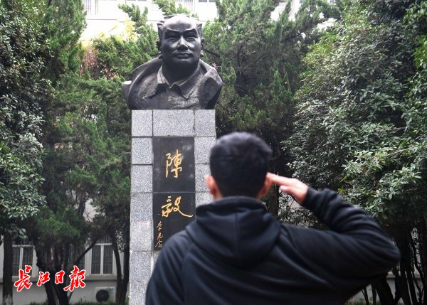 长江日报大武汉客户端11月24日讯 参天大树掩映下,陈毅元帅的铜像前,中南财经政法大学中韩新媒体学院2019级学生陈毅昂首挺胸,立正,敬礼!