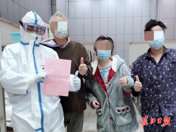 李甜一家给在方舱照顾他们的护士写了感谢信并合影 受访者供图