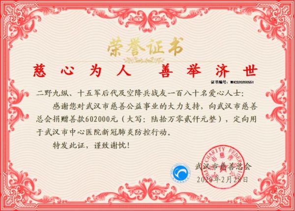 感谢你们对武汉市慈善公益事业的大力支持,向武汉市慈善总会捐赠善款602000元,定向用于武汉市中心医院新冠肺炎防控行动。