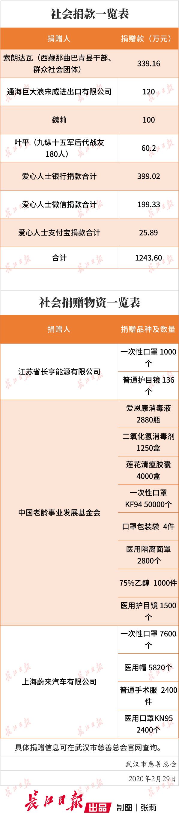 长江日报-长江网3月1日讯(记者杨帆 通讯员汪亮)1月23日,武汉市新冠肺炎防控指挥部发布第4号通告,武汉市慈善总会负责接受捐款和通用物资。现将2月28日-29日武汉市慈善总会接收捐赠款物公示如下(具体款物使用和分配方案随后公布):
