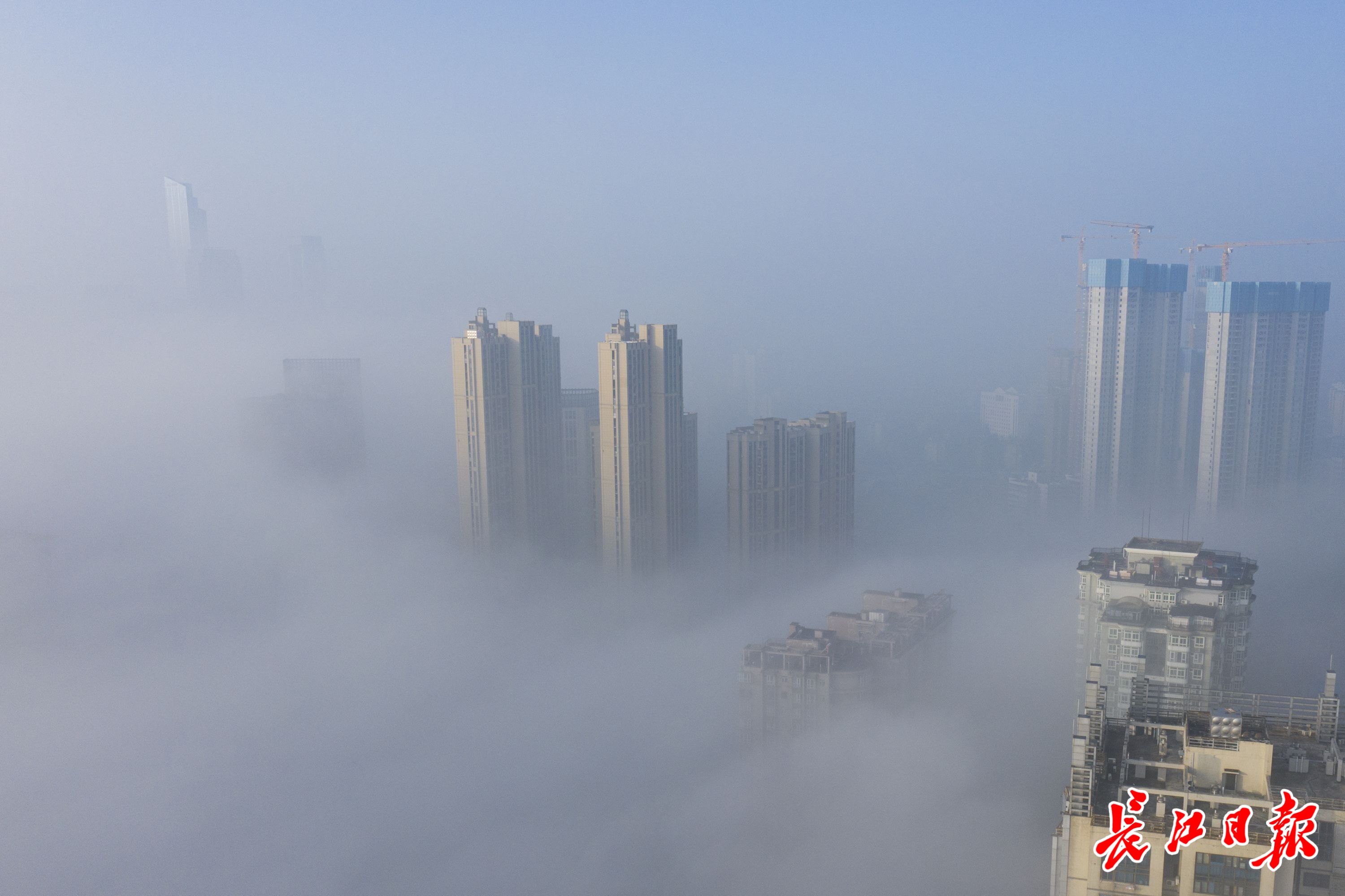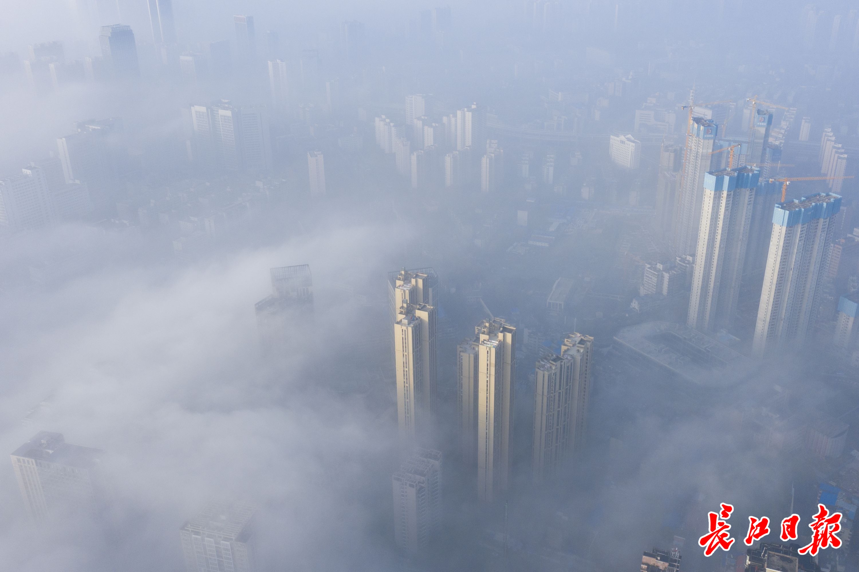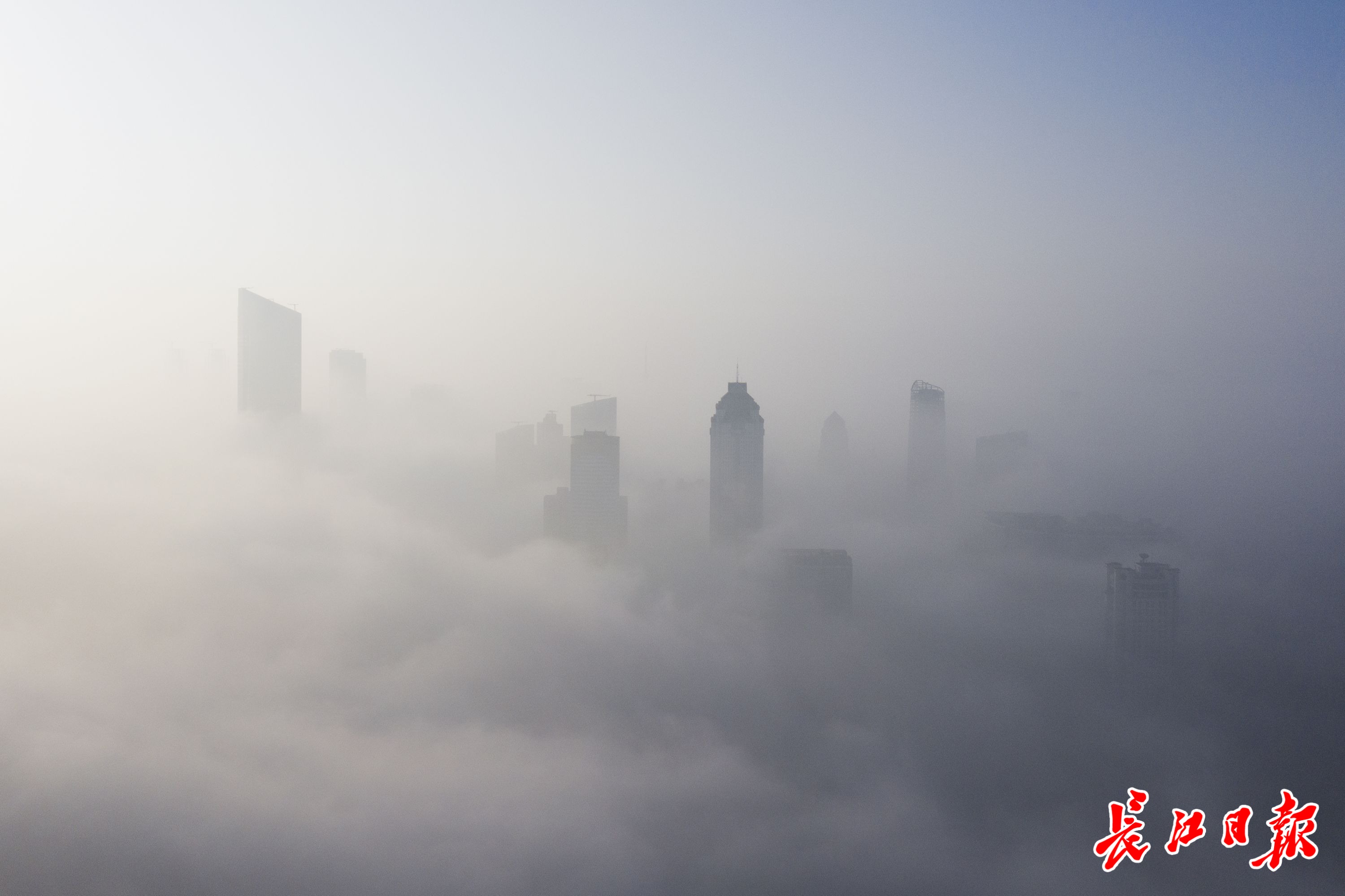 26日上午8时左右,武汉出现平流雾,云雾在城市的高楼间缭绕移动,城区笼罩在升腾的云雾之中。