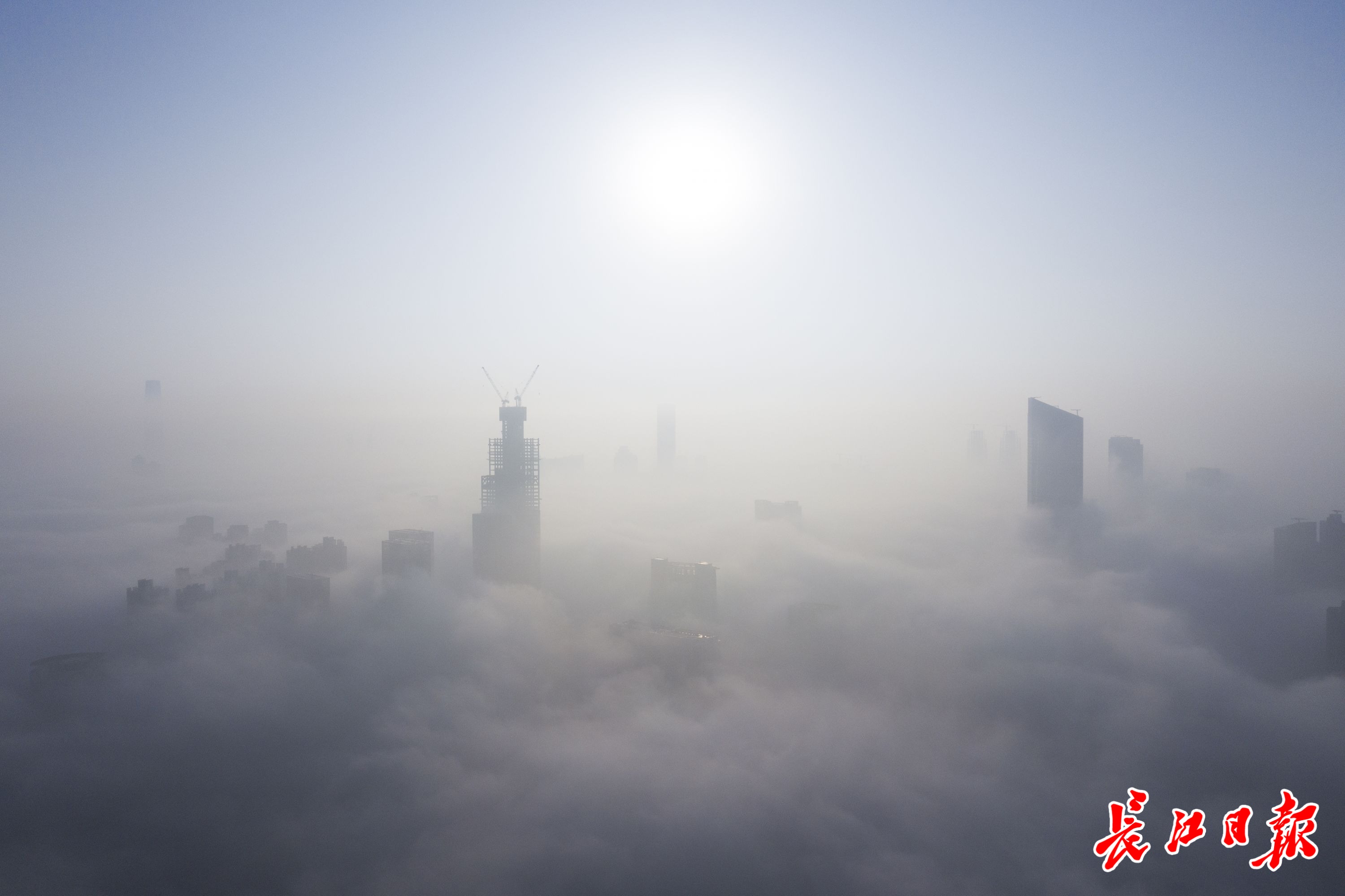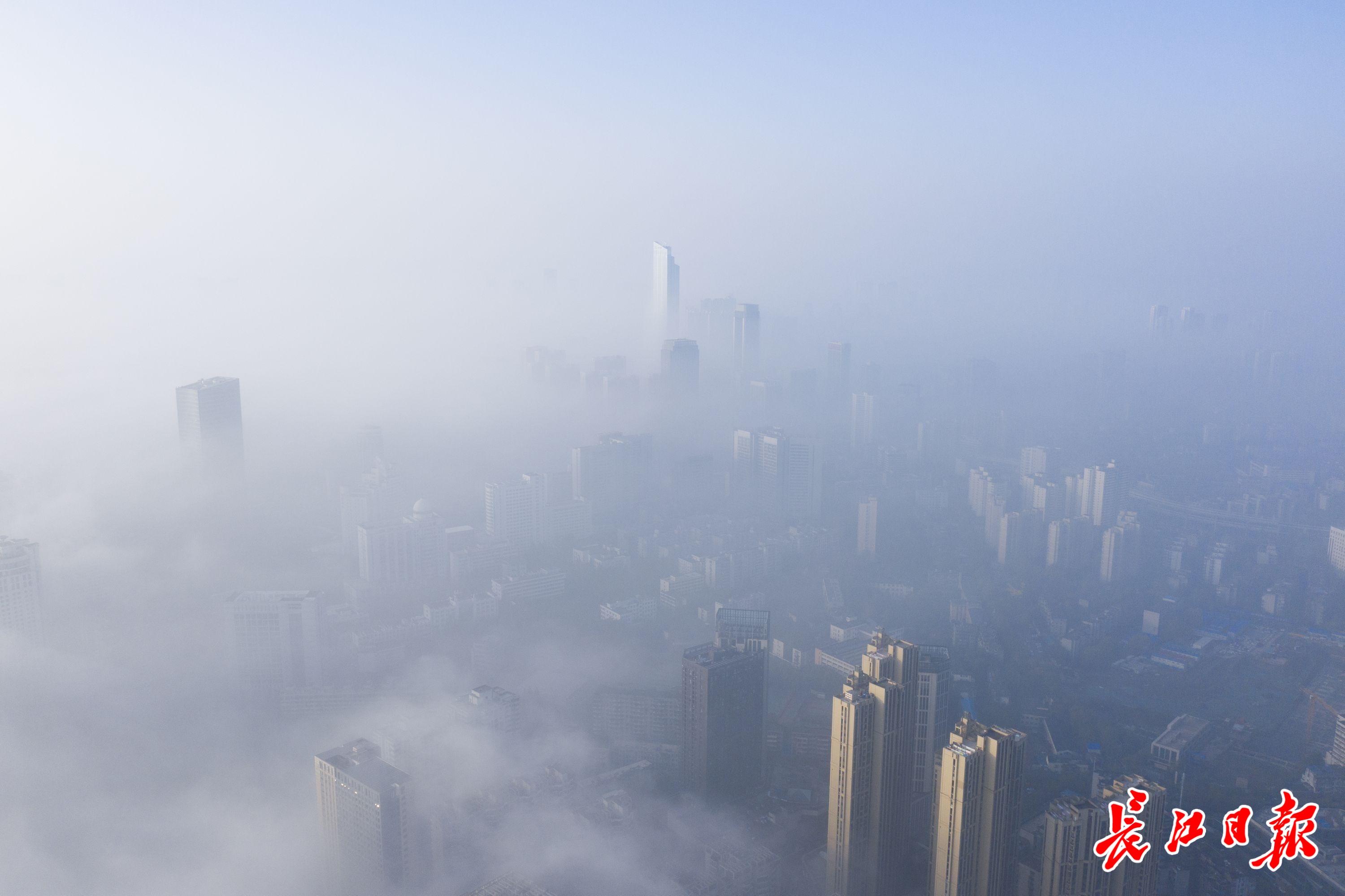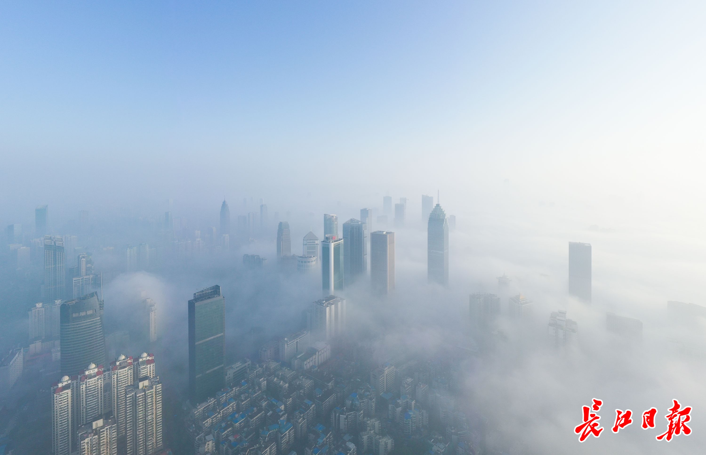 26日上午8时左右,武汉出现平流雾,云雾在城市的高楼间缭绕移动,城区笼罩在升腾的云雾之中。