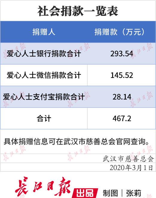 长江日报-长江网3月2日讯(记者杨帆 通讯员汪亮)1月23日,武汉市新冠肺炎防控指挥部发布第4号通告,武汉市慈善总会负责接受捐款和通用物资。现将2月29日-3月1日武汉市慈善总会接收捐赠款物公示如下(具体款物使用和分配方案随后公布):