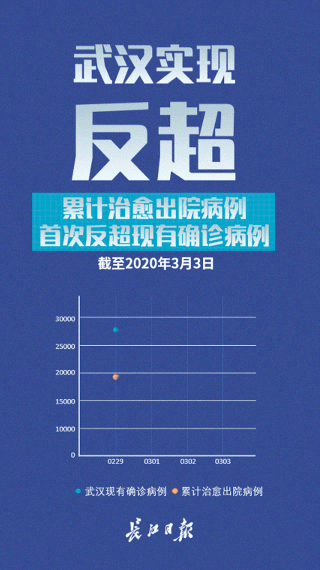 3月3日,武汉新增治愈出院病例达1859例。在本地医护团队和全国志愿医护团队的努力下,武汉从2月19日开始出现“新增治愈病例”超过“新增确诊病例”的态势,并一直持续至今。