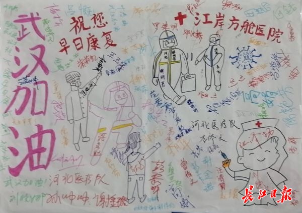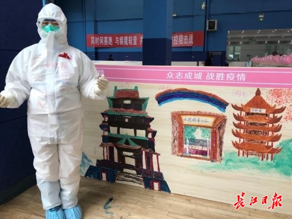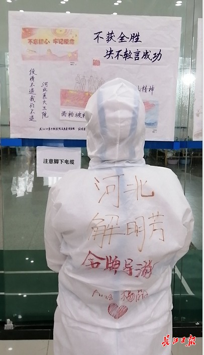 于是,在患者与医护人员的画笔下,河北与武汉的美景在此刻相遇,大家也开开心心在方舱医院里来了一次“半日游”。更有心情大好的患者在解明芳护士长的防护服上挥笔题字——金牌导游。