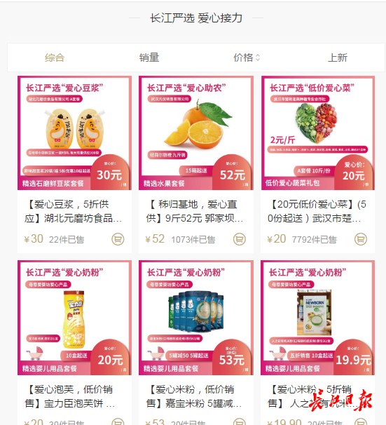 在长江严选“爱心专区”页面,有5折供应的爱心豆浆、10元10斤的爱心蔬菜包,还有5折销售的婴儿奶粉和米粉,“很多供应商和我们对接时,都主动提出以‘爱心价’销售”,长江严选平台负责人表示,“全国爱心物资都在驰援武汉,作为一家公益电商平台,更有责任丰富平台产品种类,确保产品质量,满足更多武汉人的个性化需求”。