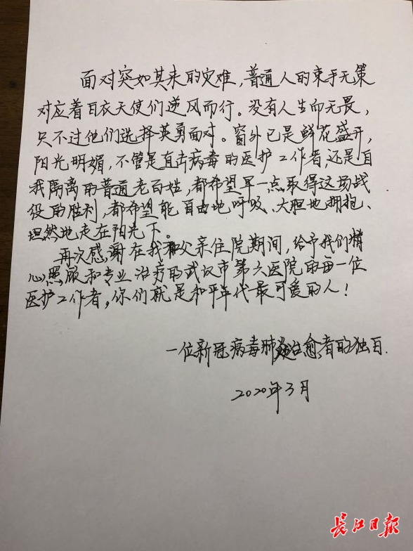 长江日报-长江网3月6日讯(记者刘璇 通讯员刘望)“面对突如其来的灾难,普通人的束手无策对应着白衣天使逆风前行,没有人生无畏,只不过他们选择英勇面对。再次感谢在我和父亲住院时,给我们精心照顾和专业治疗的武汉市第六医院每一位医护工作者,你们是和平年代最可爱的人。”3月6日,武汉市光华路小学41岁语文老师刘婷结束了14天的隔离,给武汉市第六医院主治医生团队手写了一封感谢信,再次表达自己的谢意。