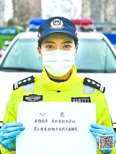 武汉市公安局交通管理局汉警快骑周艳:疫情结束后,想带上姐妹们穿上漂亮的裙子去武大看樱花,请长江日报的摄影记者帮我们留下最美瞬间,并做成画册给我们留下纪念。