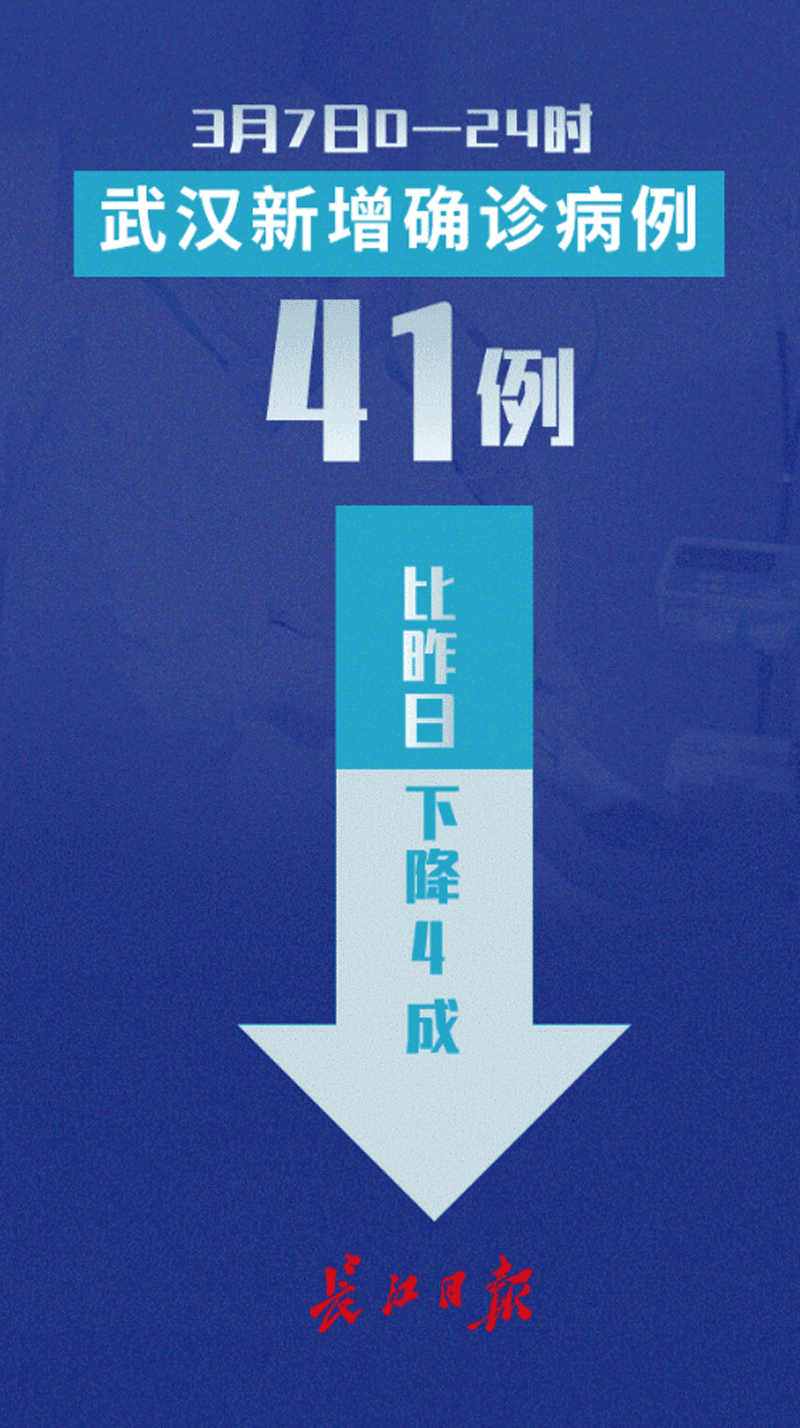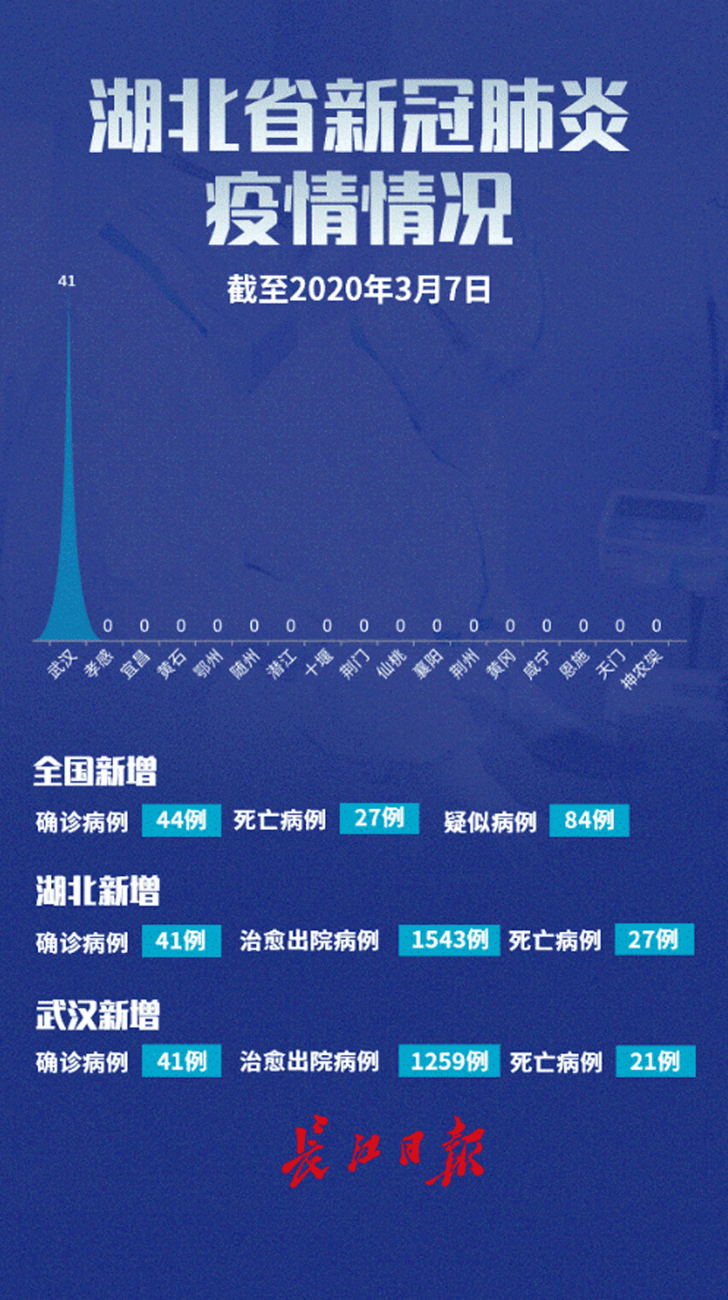 2020年3月7日0—24时,全省新增新冠肺炎确诊病例41例,其中:武汉市41例,其他16个市州均为0例。无境外输入性病例。