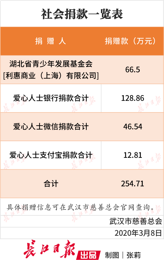 长江日报-长江网3月8日讯(记者杨帆 通讯员汪亮)1月23日,武汉市新冠肺炎防控指挥部发布第4号通告,武汉市慈善总会负责接受捐款和通用物资。现将3月7日-8日(3月7日12:00—3月8日12:00)武汉市慈善总会接收捐赠款物公示如下(具体款物使用和分配方案随后公布):