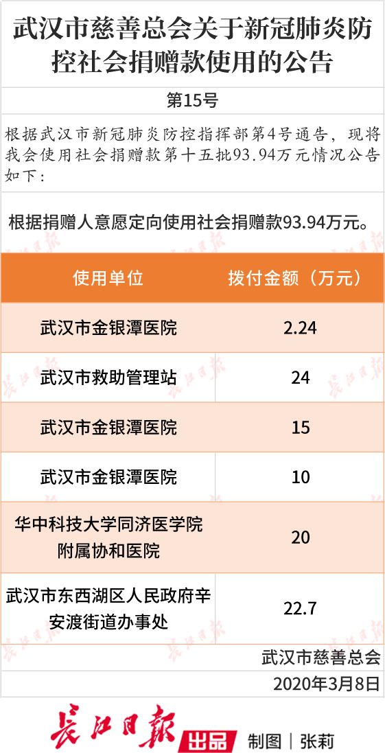 使用社会捐赠款第15批93.94万元均为定向捐赠给以下单位,明细见表格。后续使用社会捐赠款情况将陆续公布。同时,武汉市慈善总会将依法依规依程序公开透明使用社会捐赠款,欢迎社会各界监督。