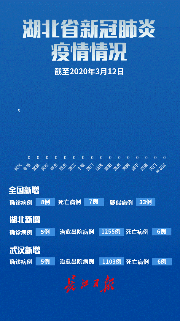 2020年3月12日0—24时,全省新增新冠肺炎确诊病例5例,其中:武汉市5例,其他16个市州均为0例。无境外输入性病例。