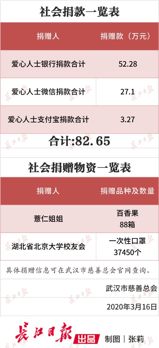 长江日报-长江网3月17日讯(记者杨帆 通讯员汪亮)1月23日,武汉市新冠肺炎防控指挥部发布第4号通告,武汉市慈善总会负责接受捐款和通用物资。现将3月15日- 16日(3月15日12:00—3月16日12:00)武汉市慈善总会接收捐赠款物公示如下(具体款物使用和分配方案随后公布):