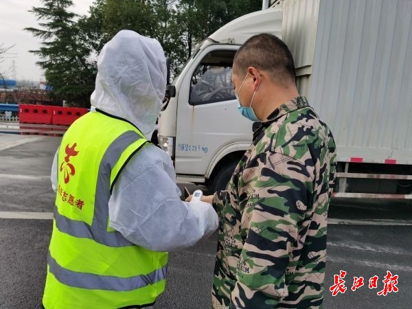 志愿者张忠为进出收费站的司机测量体温