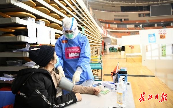 3月4日,武汉体育中心方舱医院,医务人员为患者量血压 记者金振强 摄