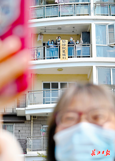 19日,洪山区南湖雅园社区居民在阳台上打出“坚持就是胜利”的字幅 记者金思柳 摄