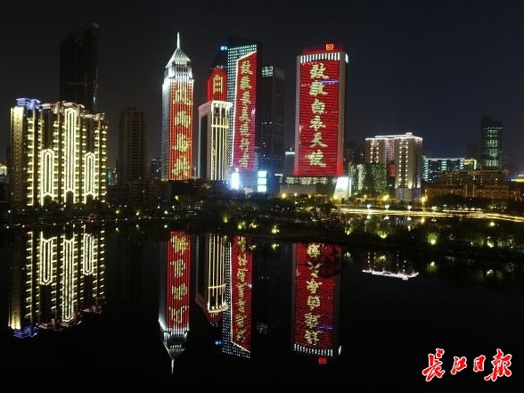 3月19日,汉口西北湖,多栋写字楼上用灯光打出“致敬白衣天使”“致敬最美逆行者”等文字,感谢医护人员 记者詹松 摄