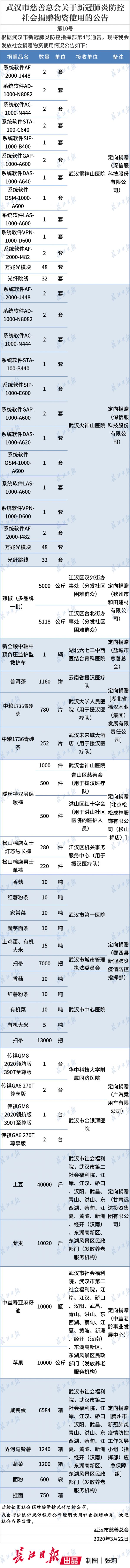 武汉市慈善总会关于新冠肺炎防控社会捐赠物资使用的公告第10号 2020-03-22 21:41 长江日报-长江网 杨帆张莉 0 长江日报-长江网3月22日讯(记者杨帆 通讯员汪亮)根据武汉市新冠肺炎防控指挥部第4号通告,现将我会发放社会捐赠物资使用情况公告如下: 制图 | 张莉 【编辑:陈学忠 戴容】 (作者:杨帆张莉)